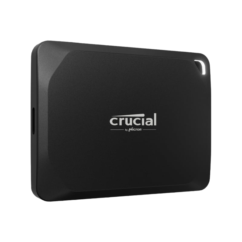Your X10 Pro Portable SSD is tough enough to travel anywhere you shoot, work, or roam, with IP55 water and dust resistance and drop-proof durability up to 7.5 feet/2 metres. The Crucial X10 Pro Portable SSD, designed by Micron, is anodized aluminium with a rubberized soft-touch base in a mini 65 x 50 mm design with a drive activity light in the integrated lanyard hole.