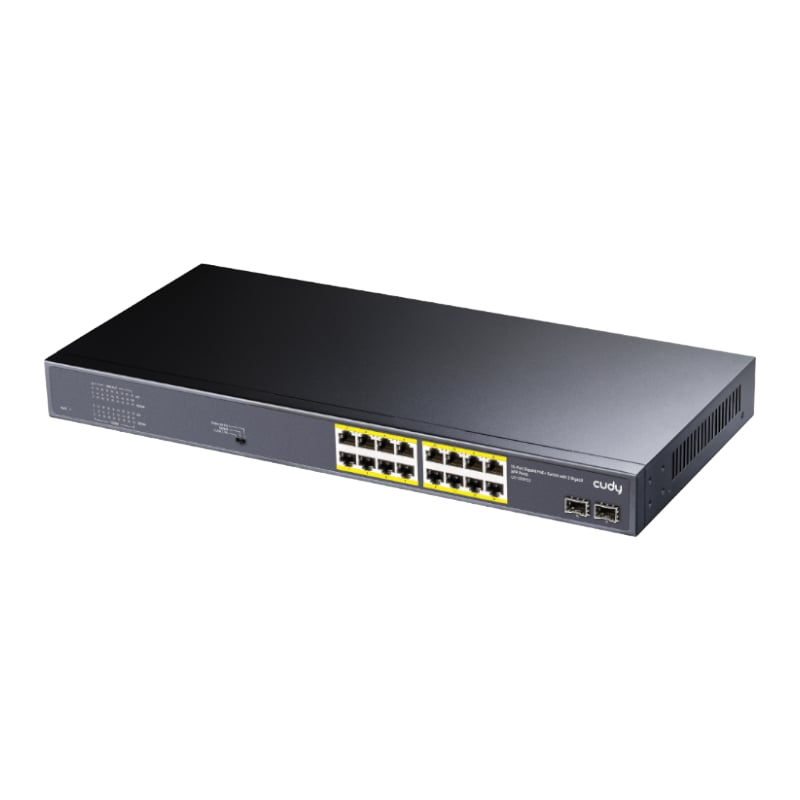 The Cudy GS1020PS2 16-Port Gigabit PoE+ Switch offers the forwarding capacity to simultaneously process traffic on all ports at a line rate without any packet loss. It supports bandwidth speeds of up to 18Gbps and features 16 PoE ports and 2 Gigabit SFP ports.