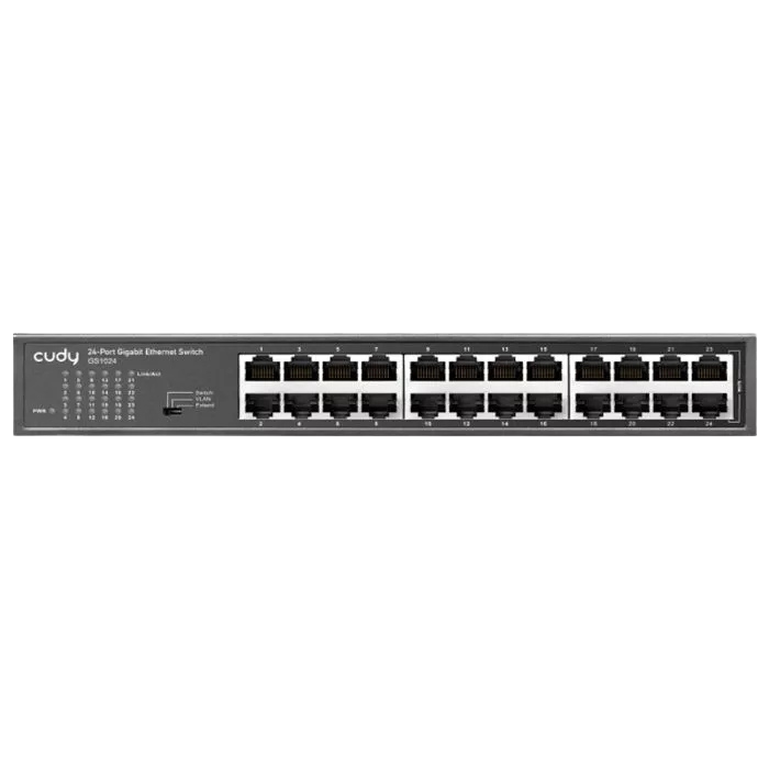 Cudy's CD-GS1024 is a 24 Port Gigabit Switch that supports both desktop and rack-mount options. It features a toggle switch with VLAN, Extender and Default modes. In Default mode all ports operate freely. VLAN mode enables port isolation on ports 1-22 while Extender mode increases the transmission distance on ports 1-22 to 250m at 10Mbps.